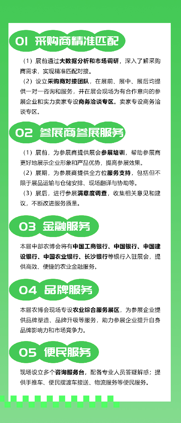 本屆中部(bu)農博會不斷優化展(zhan)(zhan)商體驗度(du),為參(can)展(zhan)(zhan)企業量身定制,“牽線搭橋”,實(shi)現參(can)展(zhan)(zhan)企業與實(shi)力賣(mai)家“一對(dui)一”無縫(feng)鏈接。
