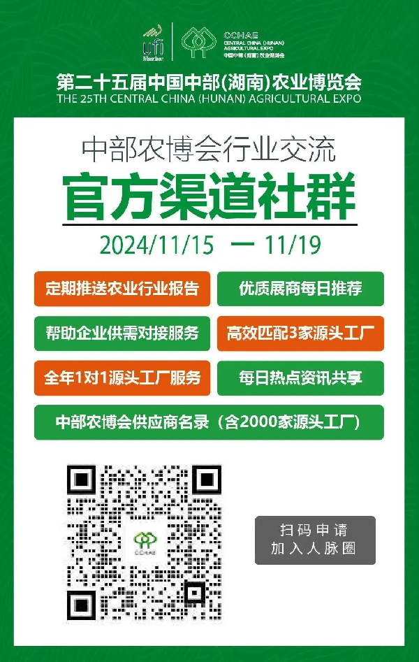 第二十五屆(jie)中(zhong)國(guo)(guo)中(zhong)部(湖南(nan))農業(ye)(ye)博覽會定于2024年11月15日至19日在長沙(sha)國(guo)(guo)際(ji)(ji)會展(zhan)中(zhong)心舉(ju)辦,共規劃(hua)茶產業(ye)(ye)館、特色美(mei)食館、品(pin)牌農業(ye)(ye)館、果蔬生(sheng)鮮冷鏈(lian)館、食品(pin)供應鏈(lian)館、省際(ji)(ji)交(jiao)流館、進出口農產品(pin)館、生(sheng)態(tai)種養館等(deng)8個展(zhan)館,展(zhan)區面積約11萬平方米,期間將舉(ju)辦巡(xun)館、中(zhong)國(guo)(guo)農業(ye)(ye)新質生(sheng)產力(li)賦能農業(ye)(ye)現代化論(lun)壇(代開幕(mu)式)、總結(jie)大會等(deng)主體活(huo)動,以及(ji)專場推介、產銷對接、直播大賽、國(guo)(guo)際(ji)(ji)交(jiao)流等(deng)系列(lie)活(huo)動。全球(qiu)農產品(pin),盡在中(zhong)部農博會。