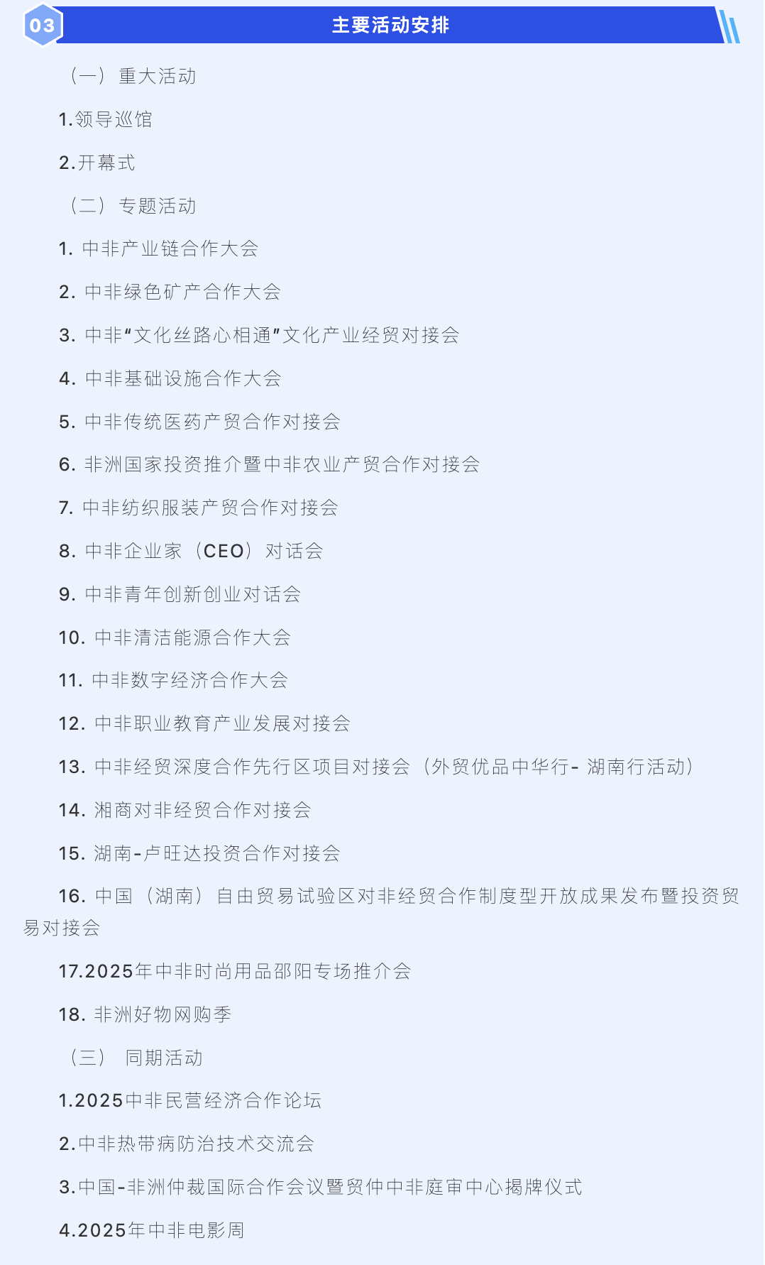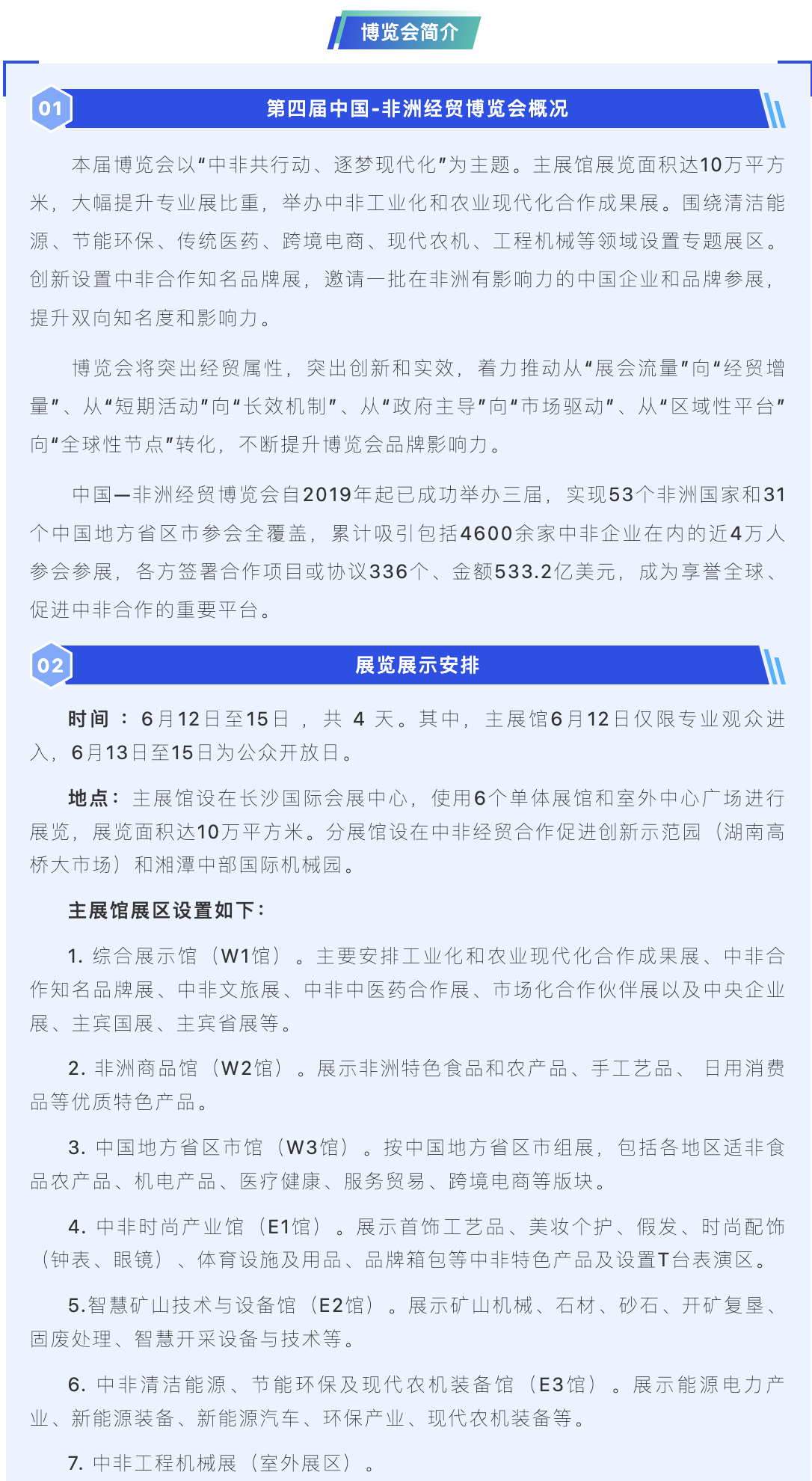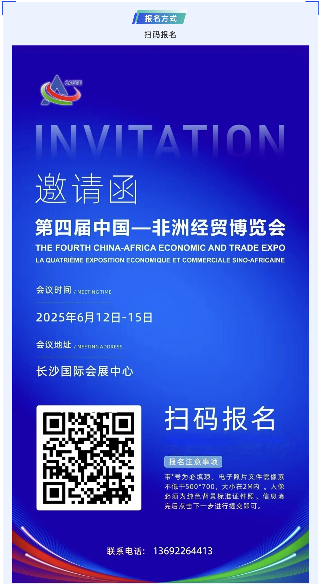中(zhong)(zhong)國(guo)-非(fei)(fei)洲經(jing)貿(mao)(mao)博(bo)覽會(hui)是中(zhong)(zhong)非(fei)(fei)合作論壇機制下(xia)最重要的(de)經(jing)貿(mao)(mao)活動(dong)平臺。為(wei)推(tui)動(dong)中(zhong)(zhong)非(fei)(fei)經(jing)貿(mao)(mao)合作高質量發展,建立多方(fang)參(can)與(yu)的(de)對非(fei)(fei)經(jing)貿(mao)(mao)合作交流長效(xiao)機制,打造地方(fang)和企業對非(fei)(fei)經(jing)貿(mao)(mao)合作新(xin)(xin)平臺新(xin)(xin)窗口,更好服務中(zhong)(zhong)非(fei)(fei)共(gong)建“一帶一路”,推(tui)動(dong)中(zhong)(zhong)非(fei)(fei)經(jing)貿(mao)(mao)合作高質量發展,為(wei)構建新(xin)(xin)時代更加緊密的(de)中(zhong)(zhong)非(fei)(fei)命運共(gong)同體貢獻力量湖南省人(ren)民政(zheng)府(fu)和商務部定于(yu)2025年6月12日至15日在湖南省長沙(sha)市舉辦第(di)四屆中(zhong)(zhong)國(guo)-非(fei)(fei)洲經(jing)貿(mao)(mao)博(bo)覽會(hui),歡迎(ying)大家參(can)會(hui)參(can)展!