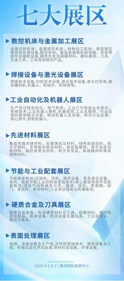 七大展(zhan)區:數(shu)控機(ji)床(chuang)與(yu)(yu)(yu)金(jin)屬加工(gong)(gong)、焊(han)接(jie)設備與(yu)(yu)(yu)激光設備、工(gong)(gong)業(ye)自動化及機(ji)器(qi)人(ren)、工(gong)(gong)業(ye)互聯(lian)網、節(jie)能與(yu)(yu)(yu)工(gong)(gong)業(ye)配套(tao)、硬(ying)質合金(jin)及刀具、先(xian)進材料